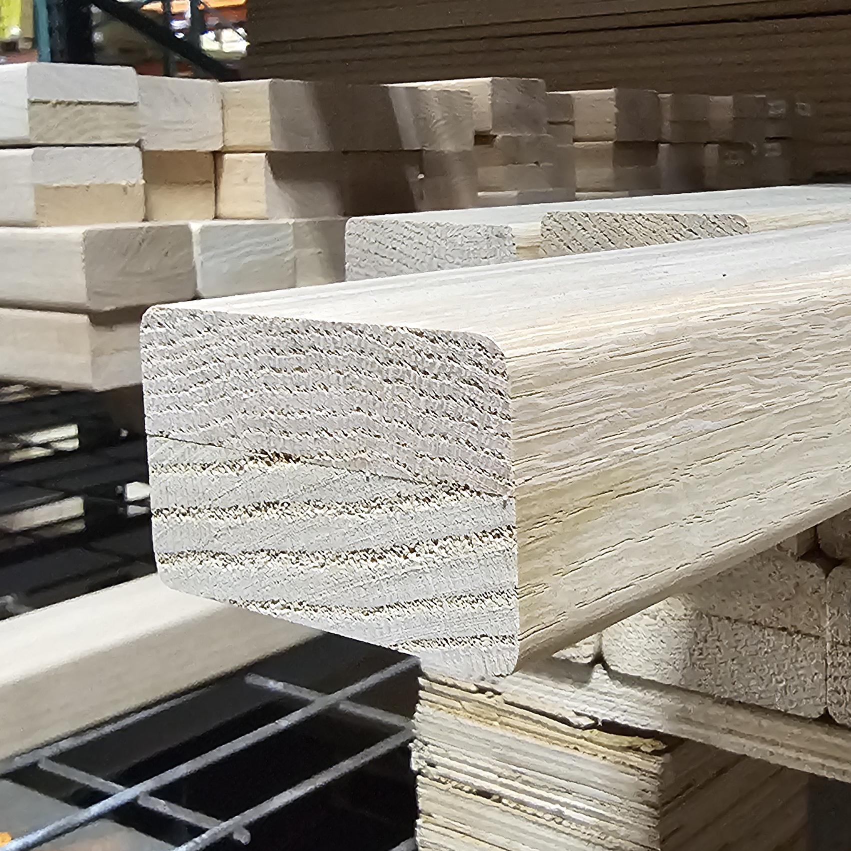 Handrail Construction – This product is a multi-layer product with a top layer and one or two bottom layers. This alternating grain pattern construction helps prevent warping. See additional photos.